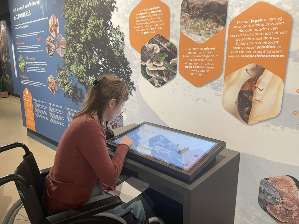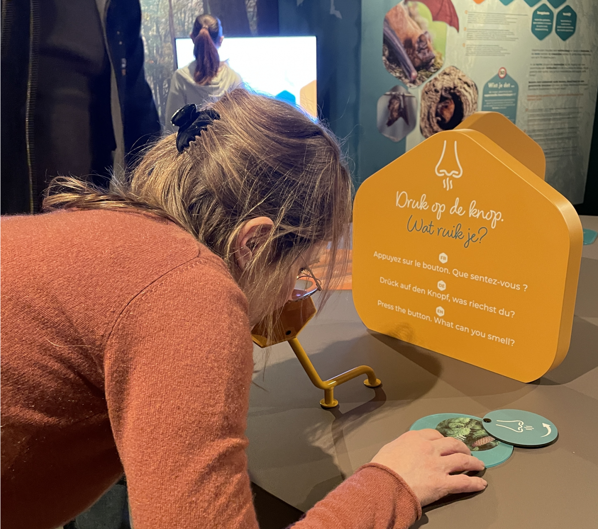 Dans chaque salle, une table centrale stimule vos sens : des plaques tactiles vous permettent de découvrir les spores des champignons et les différentes structures des ailes d’insectes. À l’aide d’une loupe, vous observez la finesse des détails de la nature. Grâce à une plaque vibrante et un cornet, vous ressentez et entendez le son particulier émis par le mâle du Micronecte bruyant pour séduire une femelle. Des éléments olfactifs complètent l’expérience.